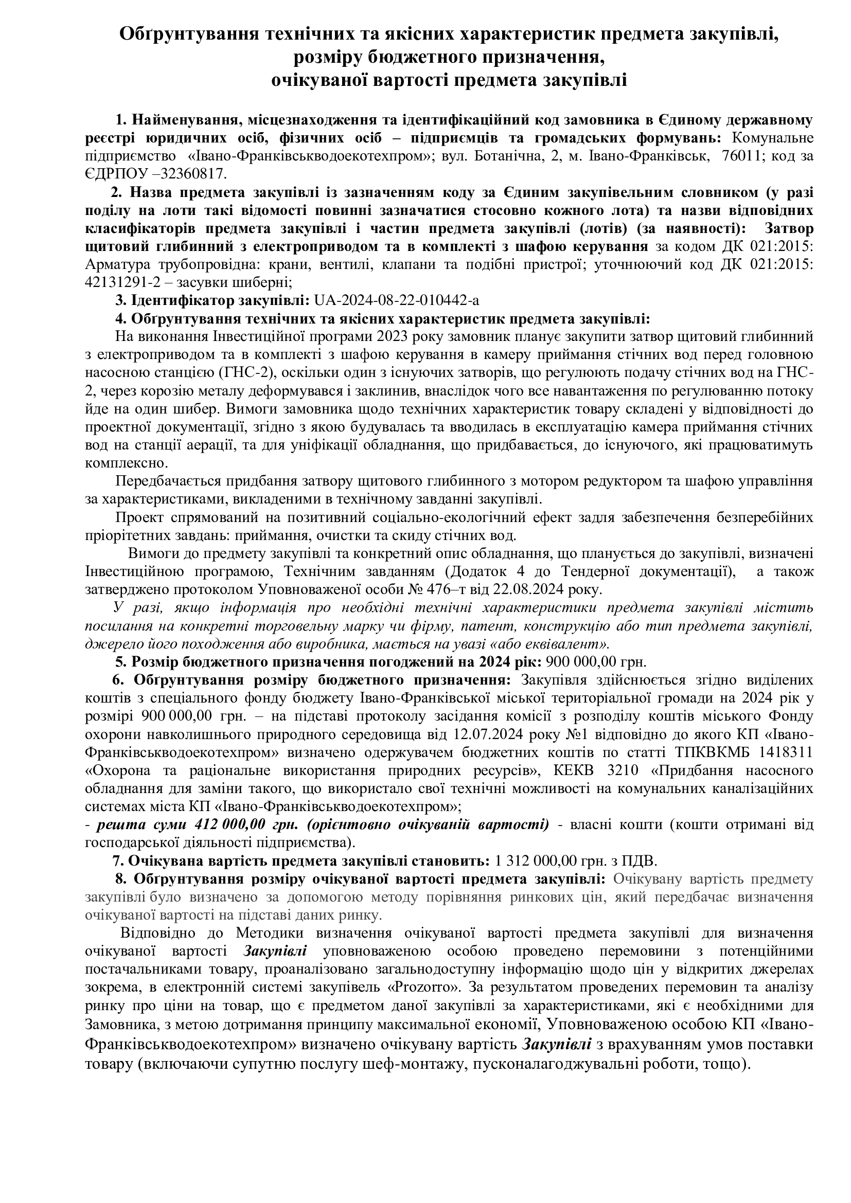Обґрунтування технічних та якісних характеристик предмета закупівлі, розміру бюджетного призначення, очікуваної вартості предмета закупівлі