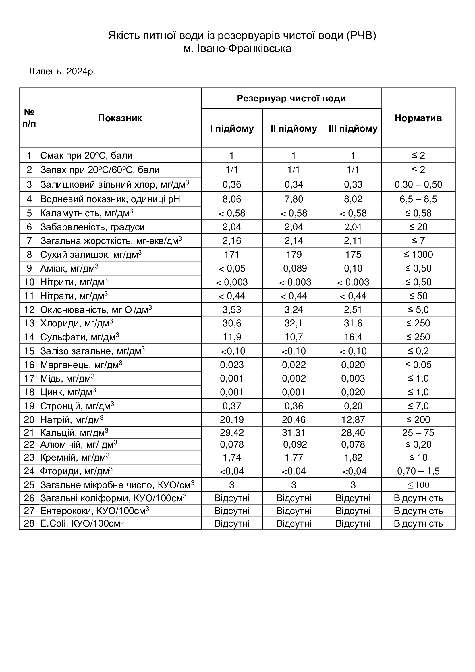 Якість питної води із резервуарів чистої води (РЧВ) м. Івано-Франківська липень 2024 р.