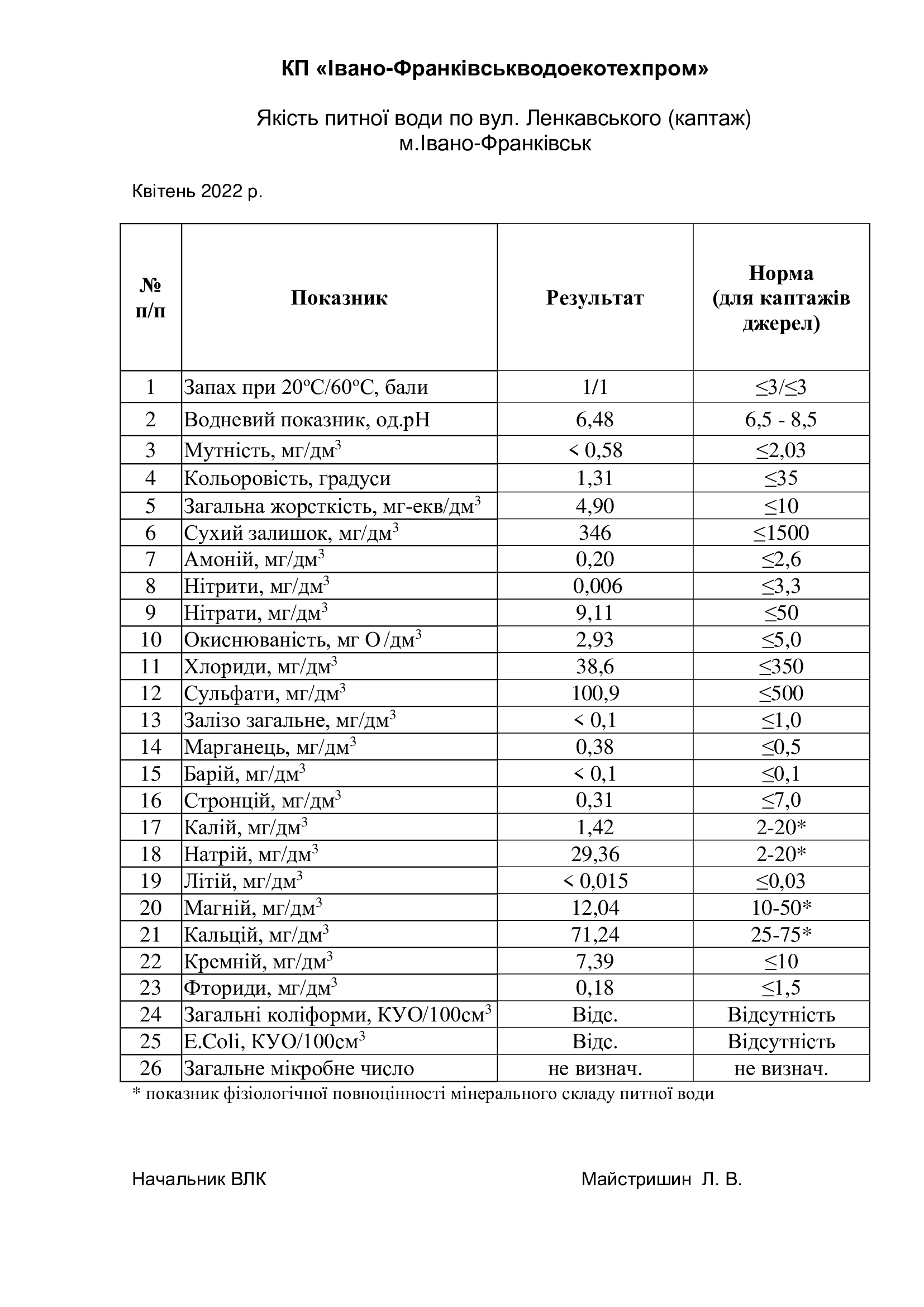 Якість питної води із резервуарів чистої води (РЧВ) Ленкавського квітень 2022р.