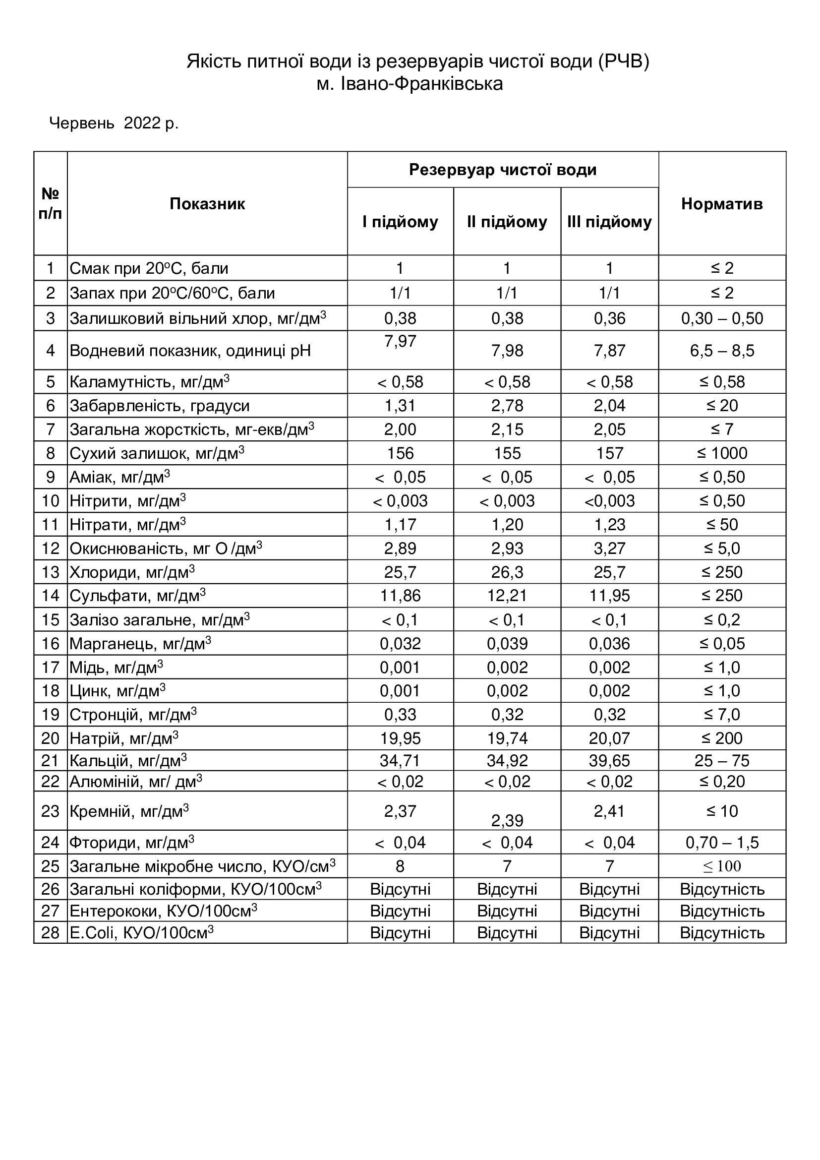 Якість питної води із резервуарів чистої води (РЧВ) м. Івано-Франківська червень 2022 р.