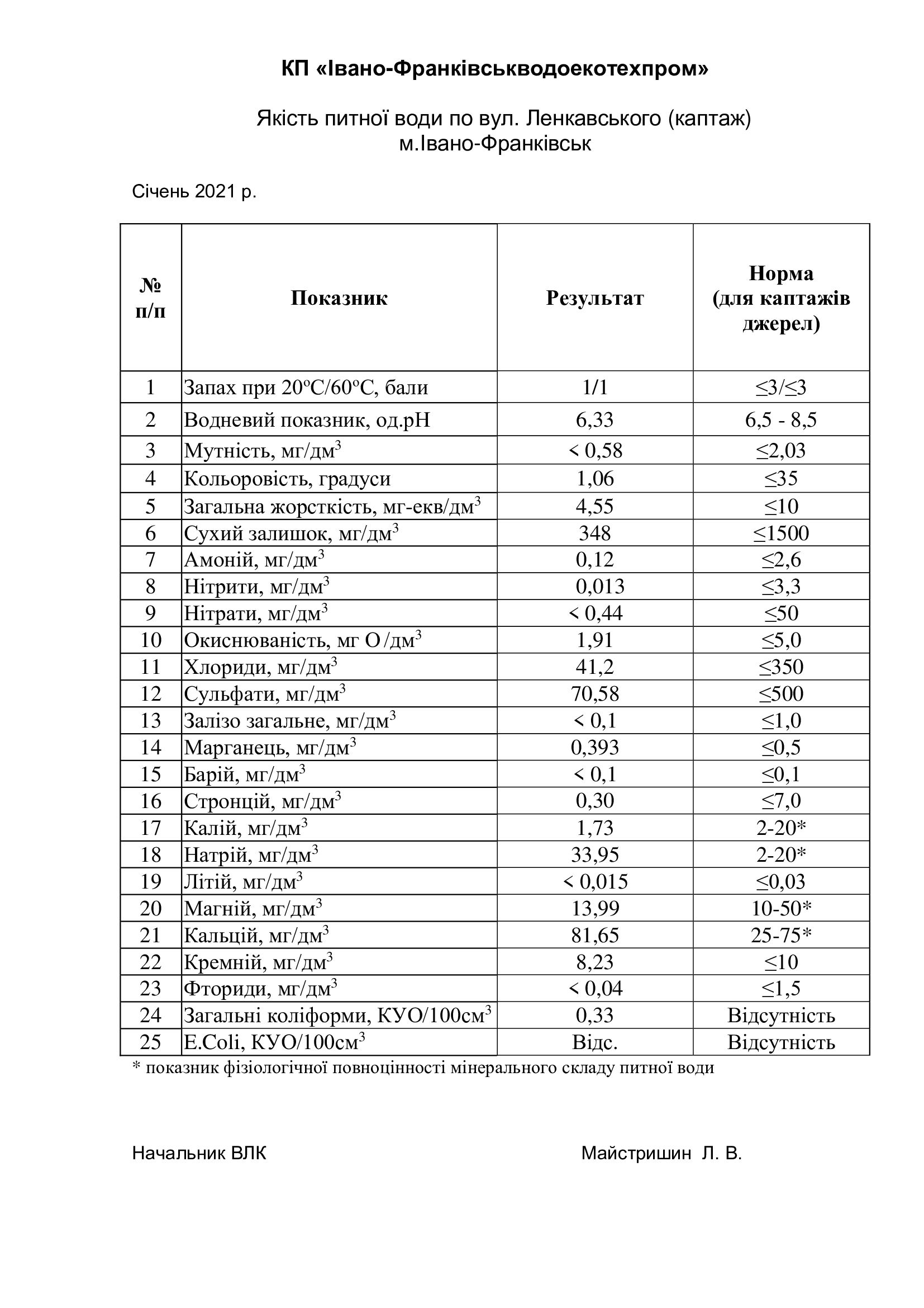 Якість питної води із резервуарів чистої води (РЧВ) Ленкавського січень 2021р.