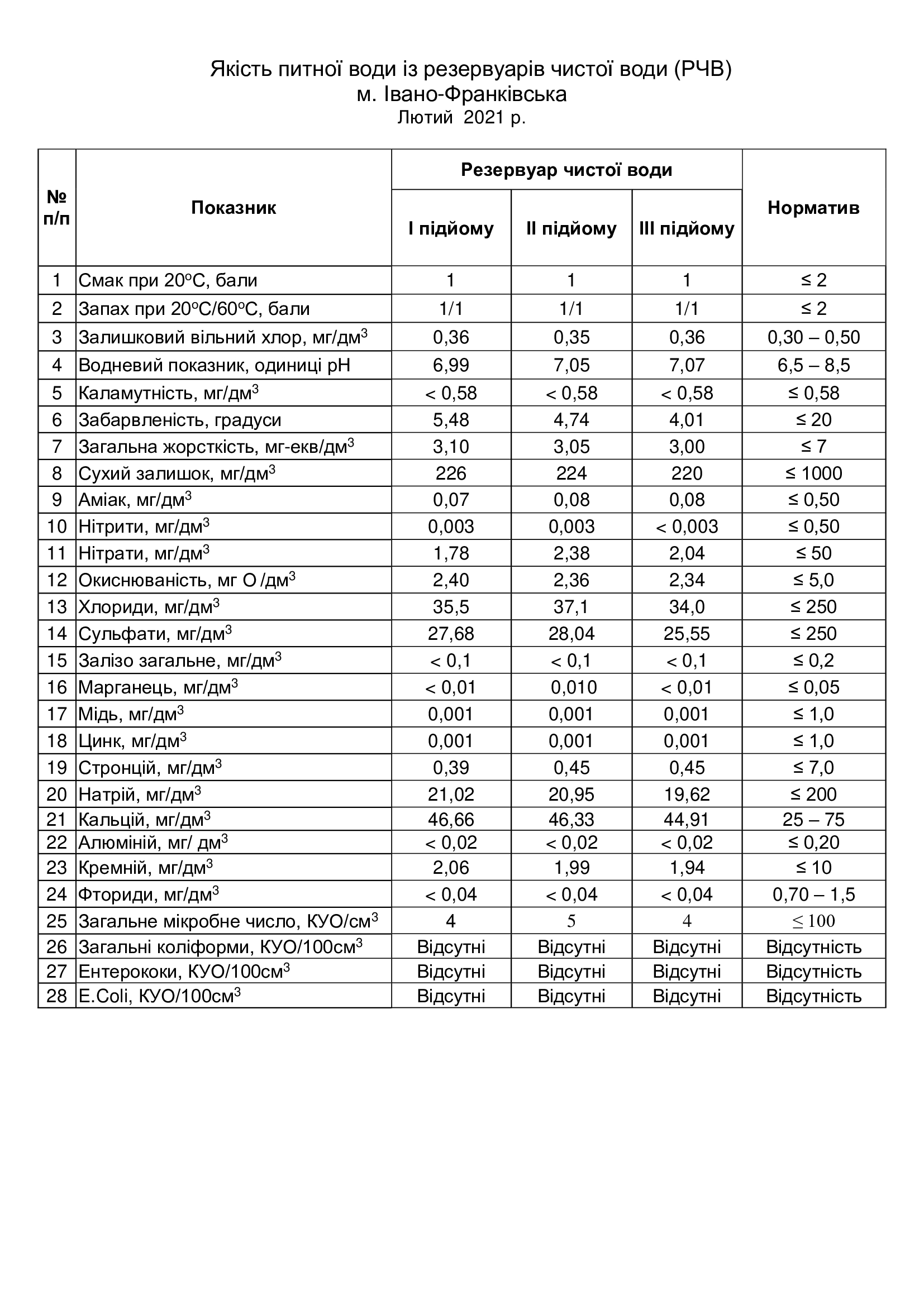 Якість питної води із резервуарів чистої води (РЧВ) м. Івано-Франківська Лютий 2021 р.