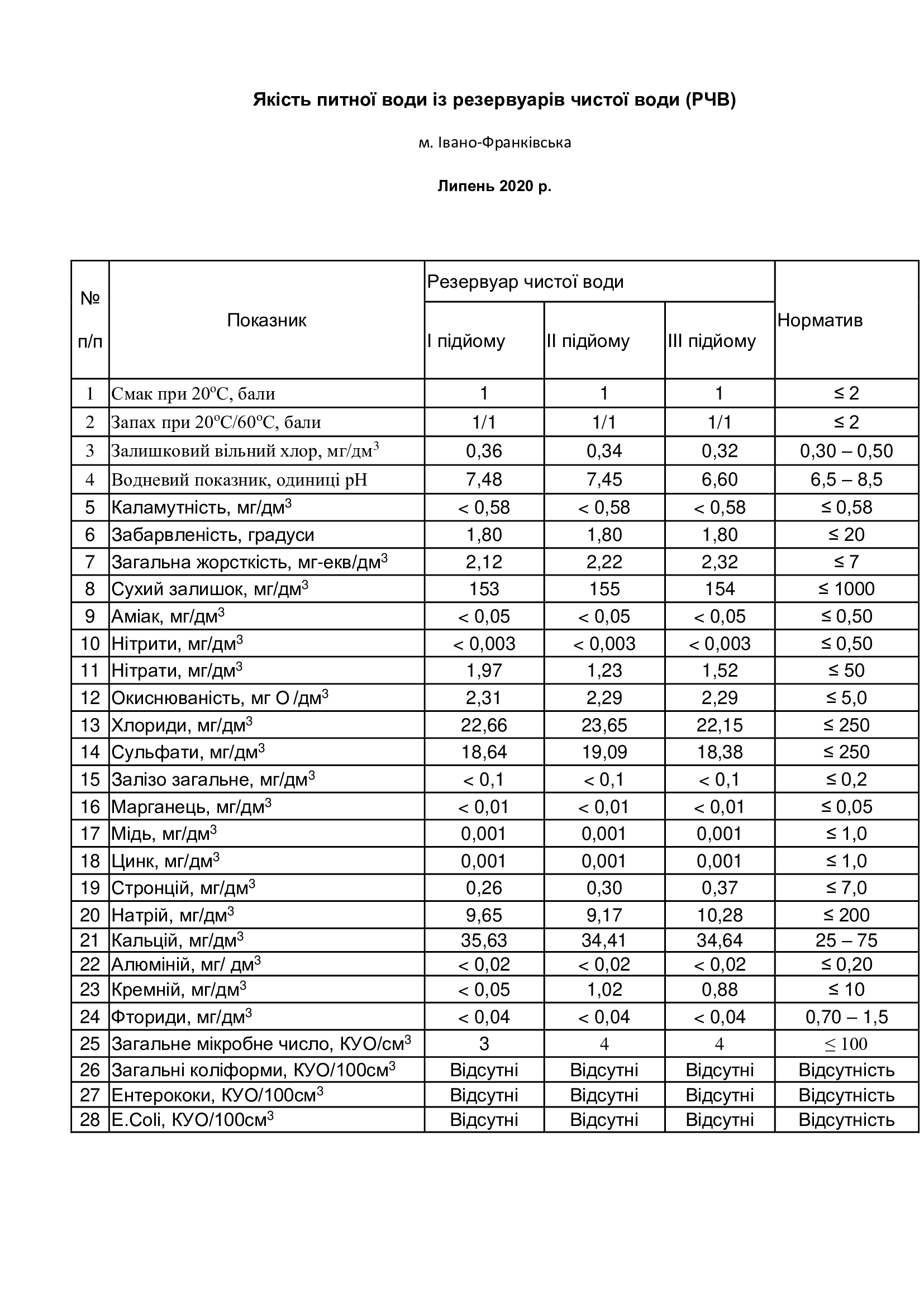 Якість питної води із резервуарів чистої води (РЧВ) липень 2020р.