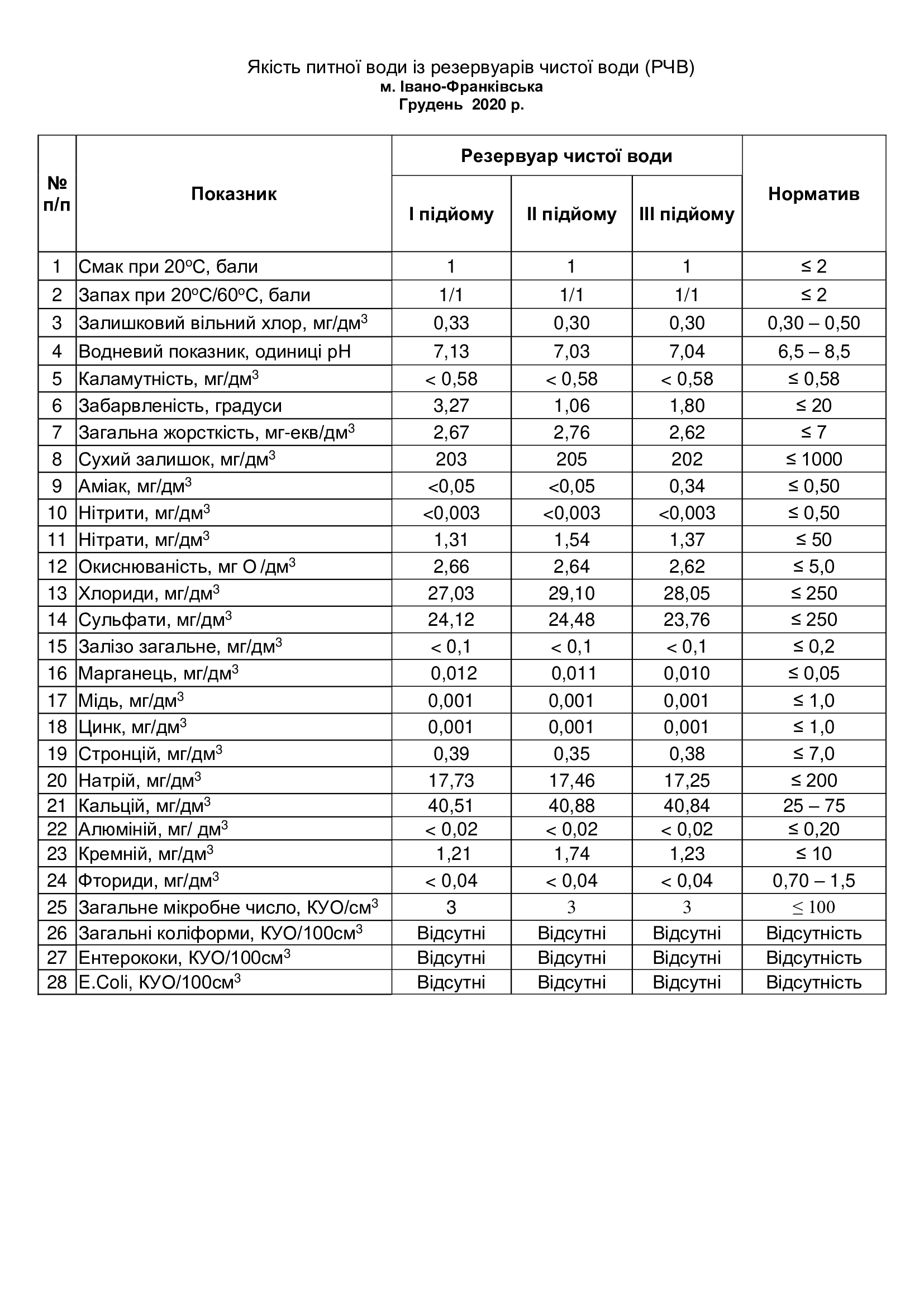 Якість питної води із резервуарів чистої води (РЧВ) грудень 2020р.
