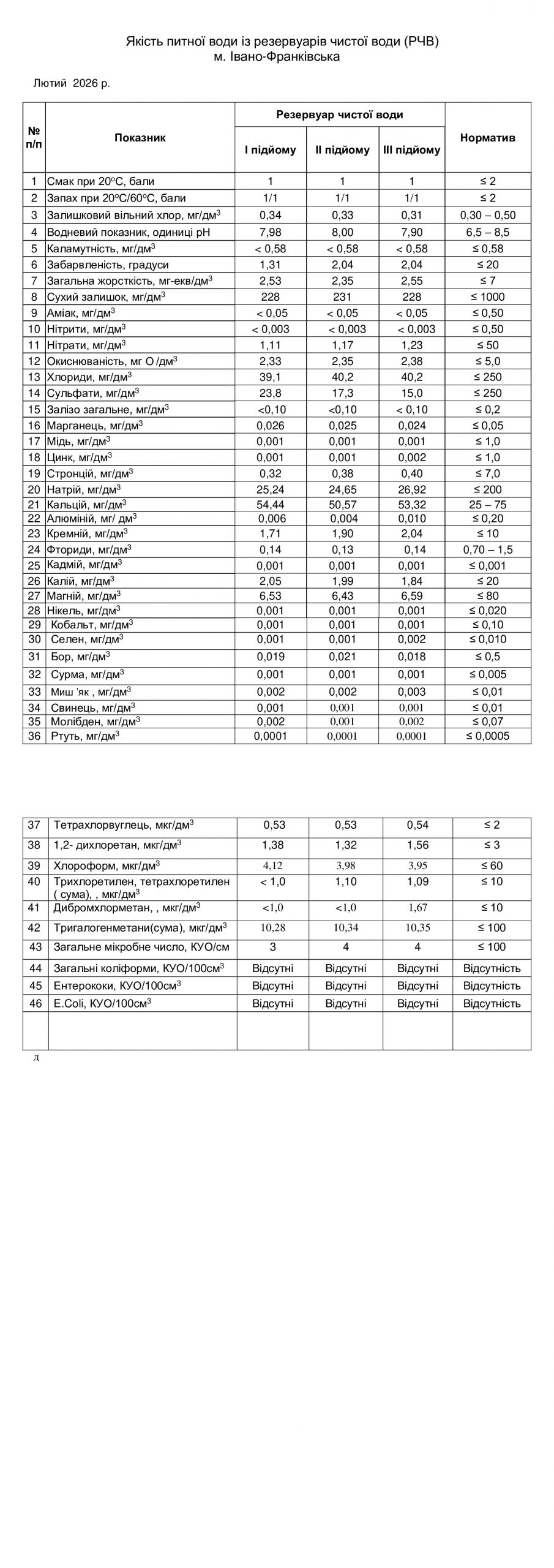 Якість питної води із резервуарів чистої води (РЧВ) м. Івано-Франківська лютий 2026 р.